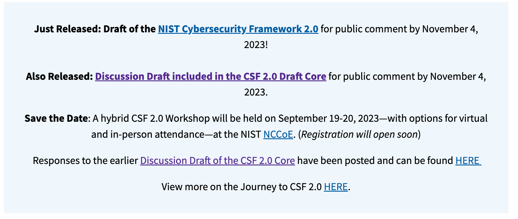 NIST values public input and feedback in the development of CSF 2.0. The draft framework is currently open for public comment until November 4, 2023. Additionally, NIST has organized workshops and working sessions to gather further feedback from stakeholders. These events provide opportunities for participants to discuss potential updates and contribute to the development of the final version of CSF 2.0. Organizations and individuals are encouraged to share their recommendations and insights to ensure that the updated framework meets the needs of a diverse range of users.